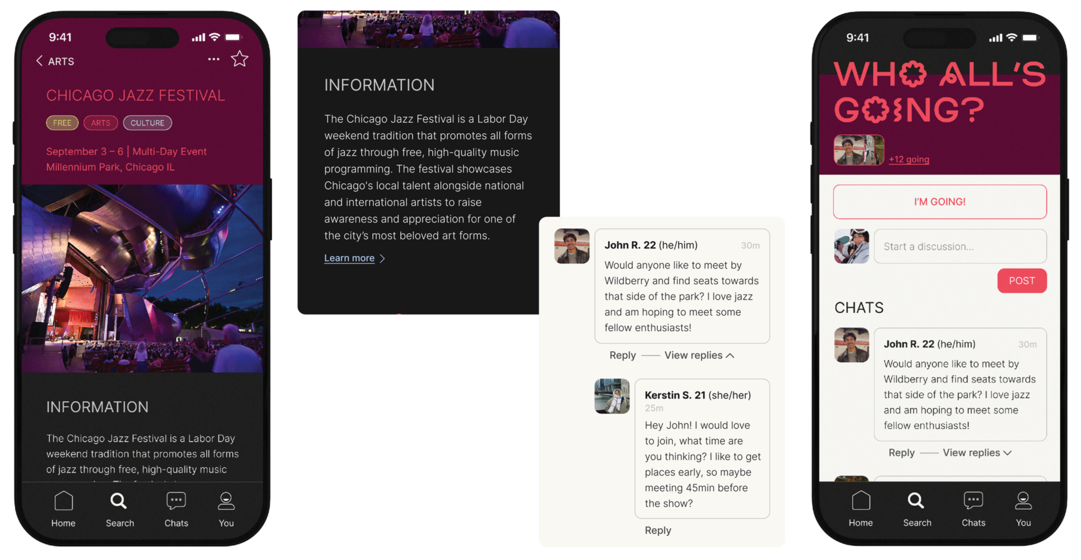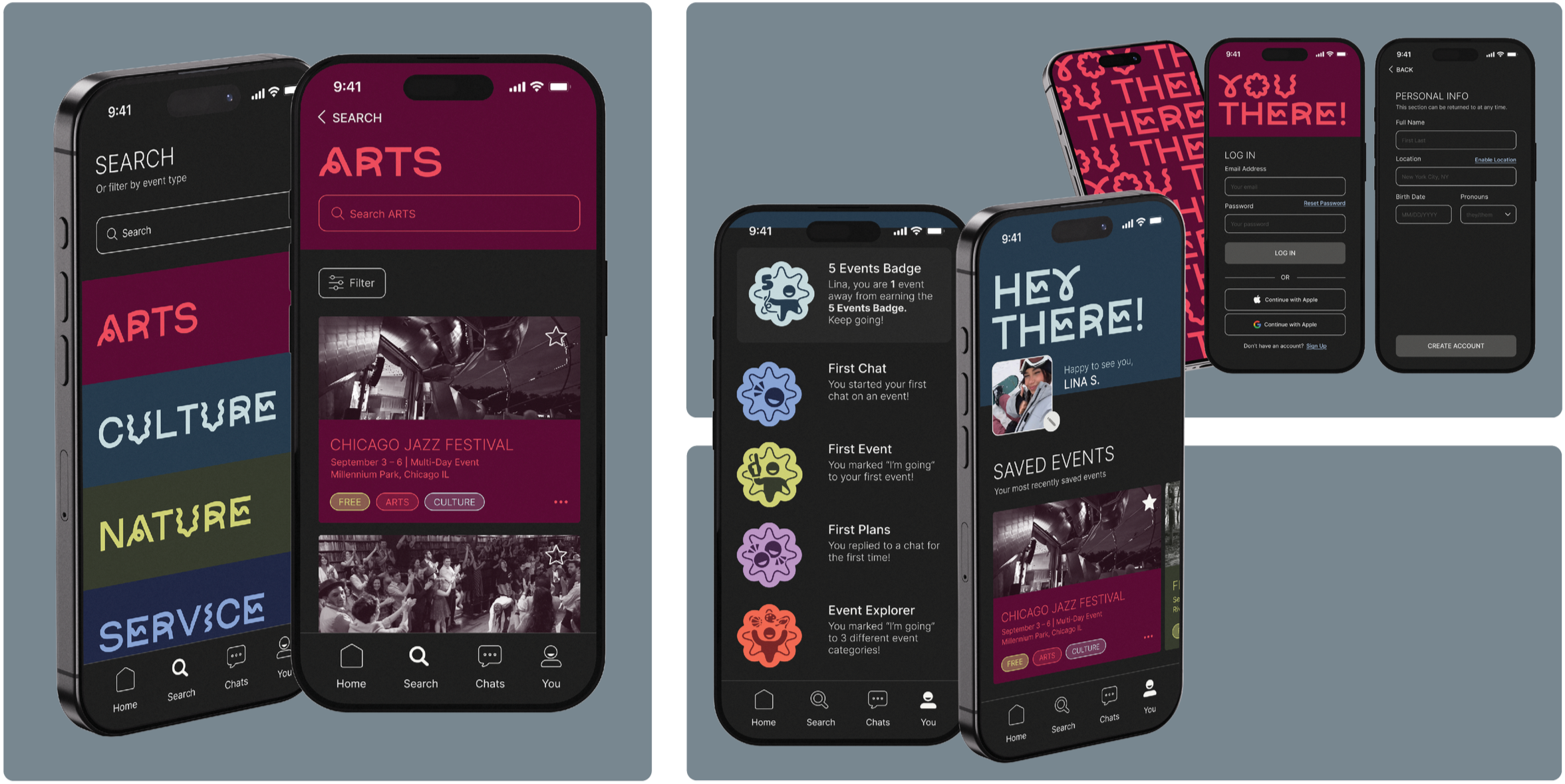 The project’s main deliverable: the You There app. Designed to allow users to easily find events near them and chat with other users who are going to the same event.