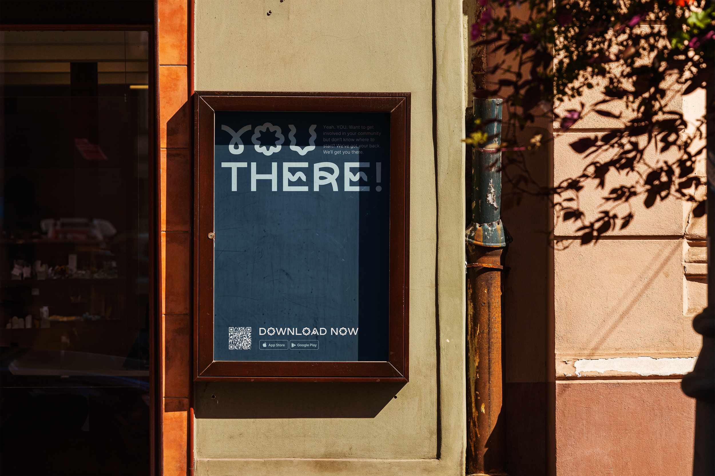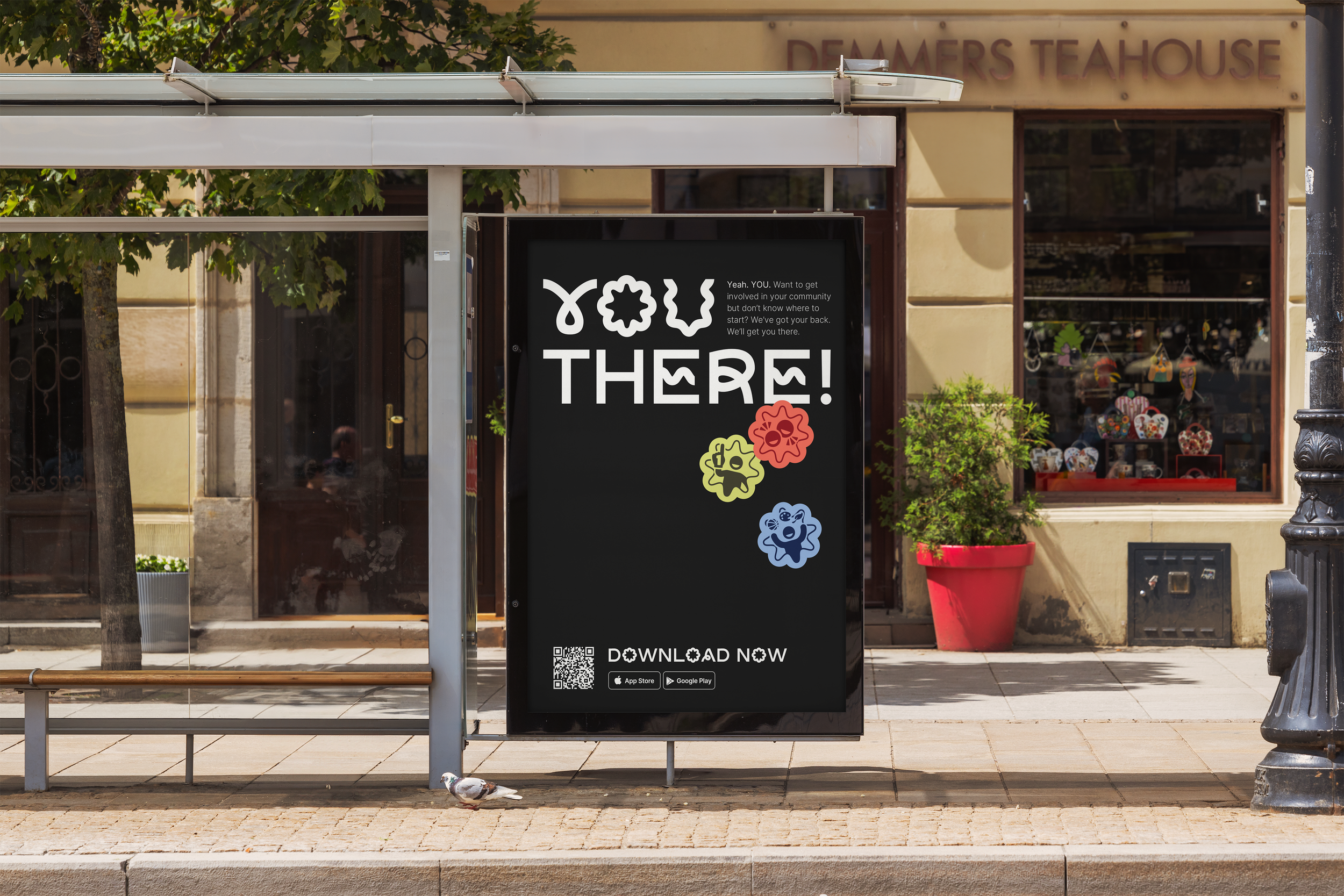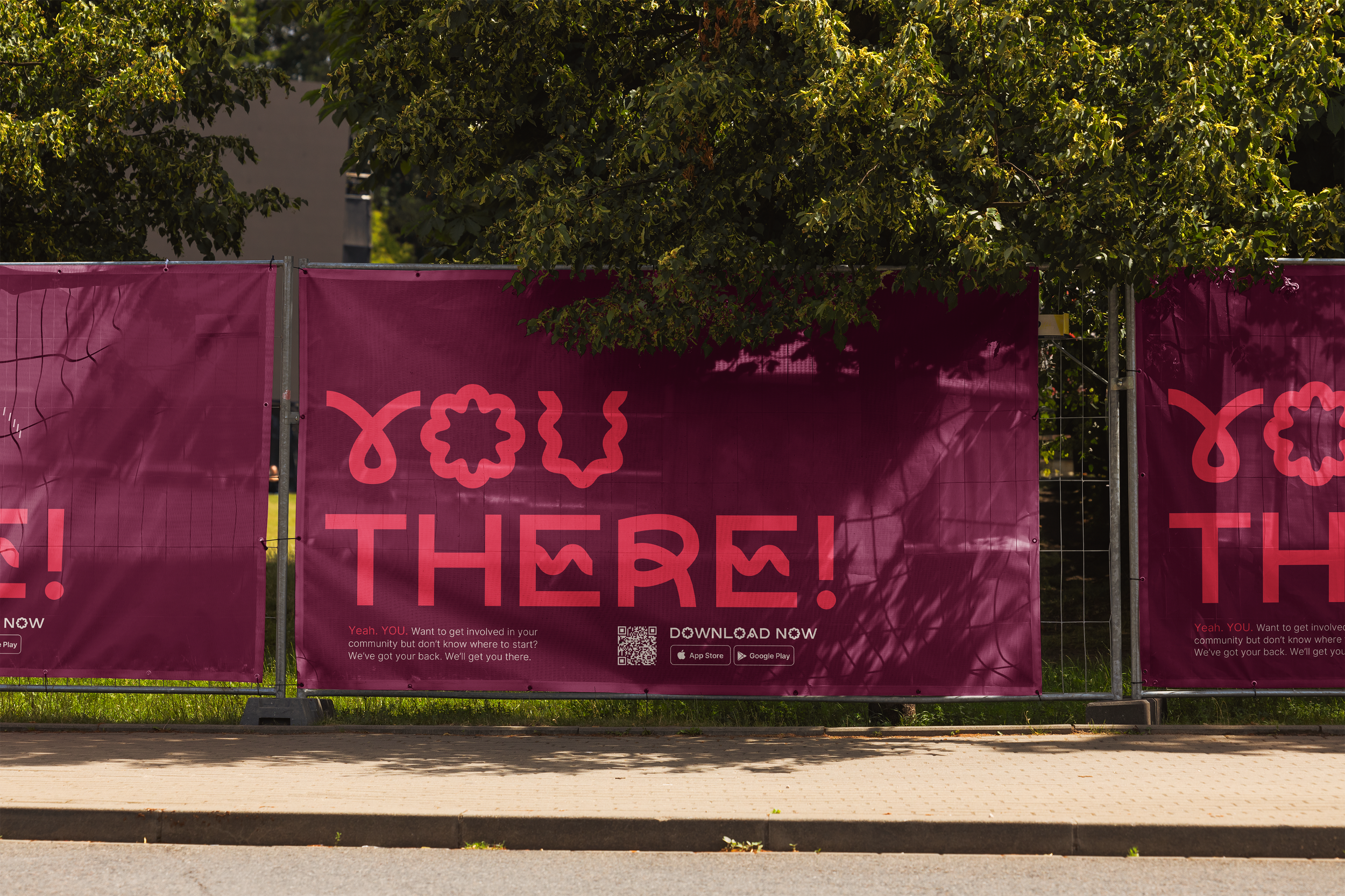 to get the word out there. The phrase, and brand namesake, You There is attention grabbing, and encourages passerby’s to stop and scan the QR code to download the You There app. Advertisements can also play into category color combinations by promoting different types of events or events relating to holidays, celebrations, and more.