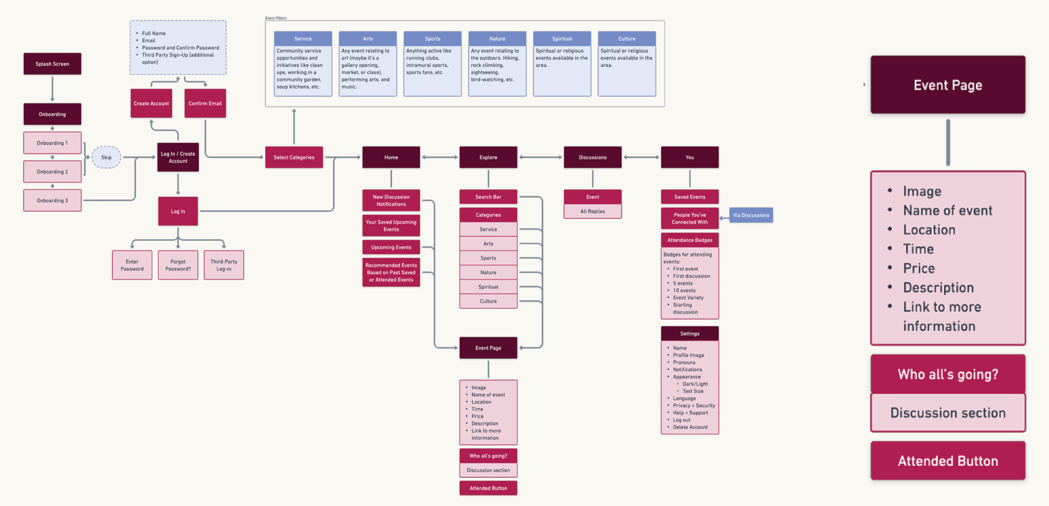 An app that hosts information about upcoming, city-based events that help connect young adults by providing information about said events, creating a clear sorting system, and providing a platform to safely and publicly make plans to meet new connections.
