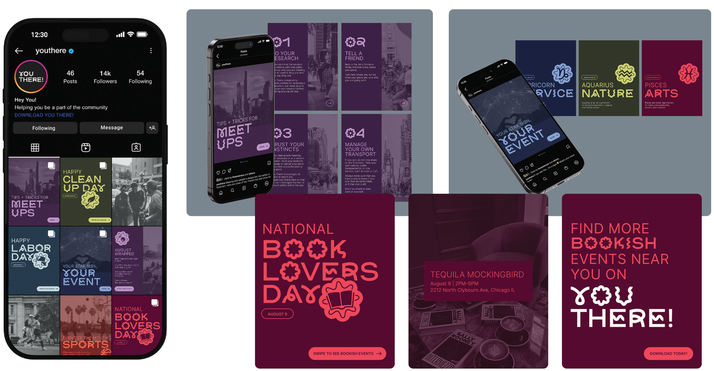 Social media material giving the brand a voice, promoting random events in different cities, providing resources to safely meet up outside of the app, and more. Social media would serve as a way to further connect You There users through sharing the unique events happening in other cities, as well as engage the audience in fun “what event type are you”